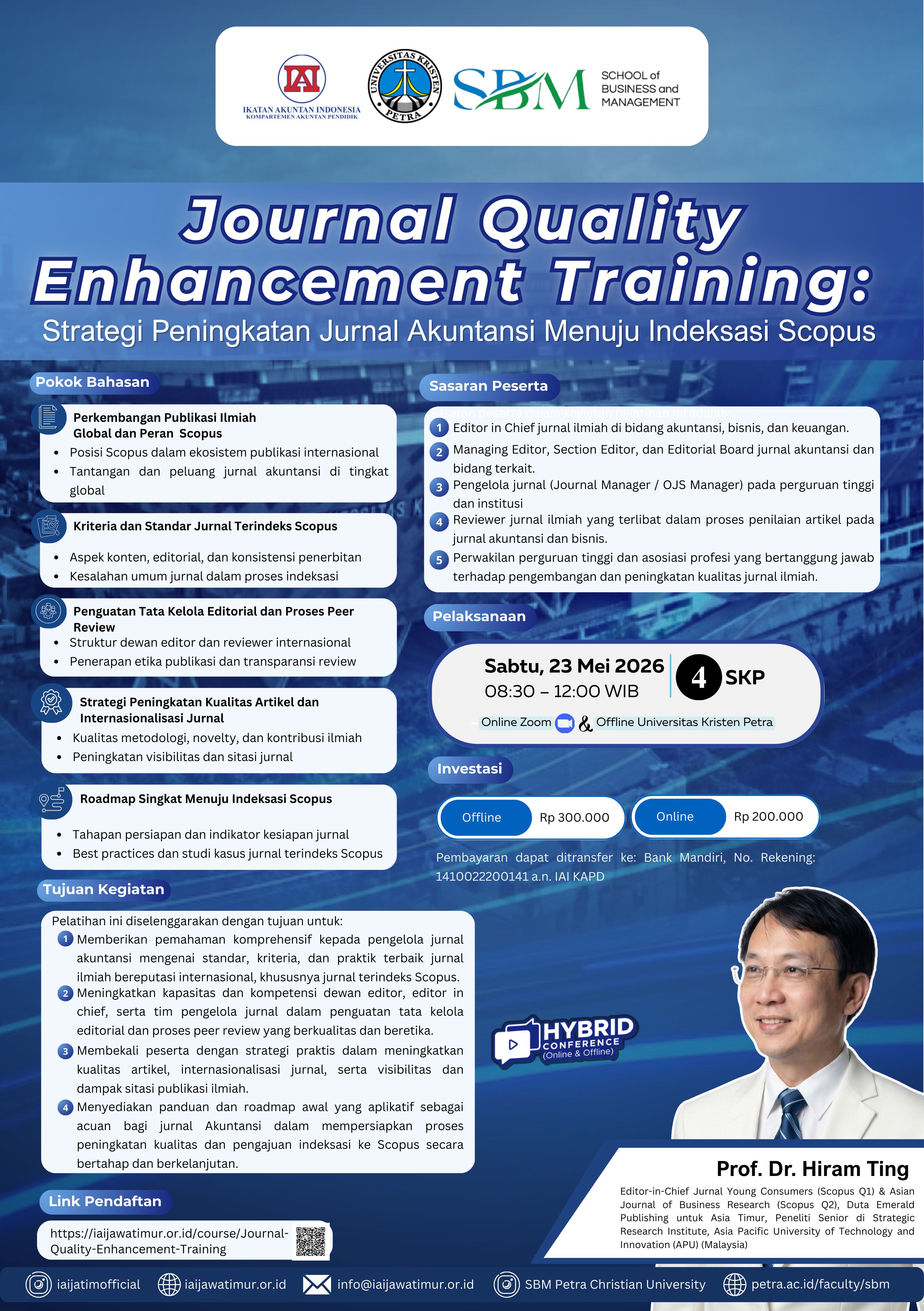 Sehubungan dengan hal tersebut, Universitas Kristen Petra bekerja sama dengan Forum Dosen Akuntansi Perguruan Tinggi (FDAPT) Jawa Timur/Ikatan Akuntan Indonesia (IAI) Wilayah Jawa Timur Bidang Akuntan Pendidik menyelenggarakan Journal Quality Enhancement Training dalam rangkaian kegiatan PIBACC 2026. Pelatihan ini dirancang untuk memberikan pemahaman komprehensif dan strategis kepada pengelola jurnal mengenai standar jurnal internasional serta langkah-langkah praktis dalam mempersiapkan jurnal menuju indeksasi Scopus. Melalui kegiatan ini, diharapkan pengelola jurnal akuntansi memperoleh wawasan, strategi, dan panduan praktis yang dapat diterapkan secara berkelanjutan dalam pengembangan jurnal masing-masing.